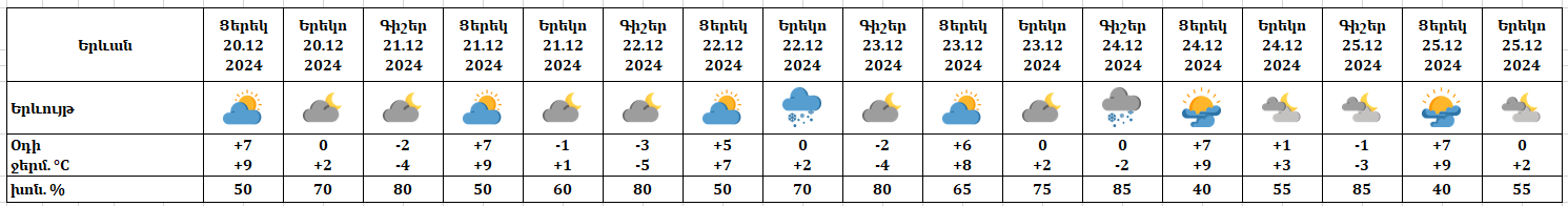 Երևան քաղաքում դեկտեմբերի 20-ի ցերեկը, 21-ին, 22-ի գիշերը, 23-25-ը սպասվում է առանց տեղումների եղանակ։ Դեկտեմբերի 22-ի երեկոյան, 24-ի գիշերը հնարավոր է թույլ ձյուն։