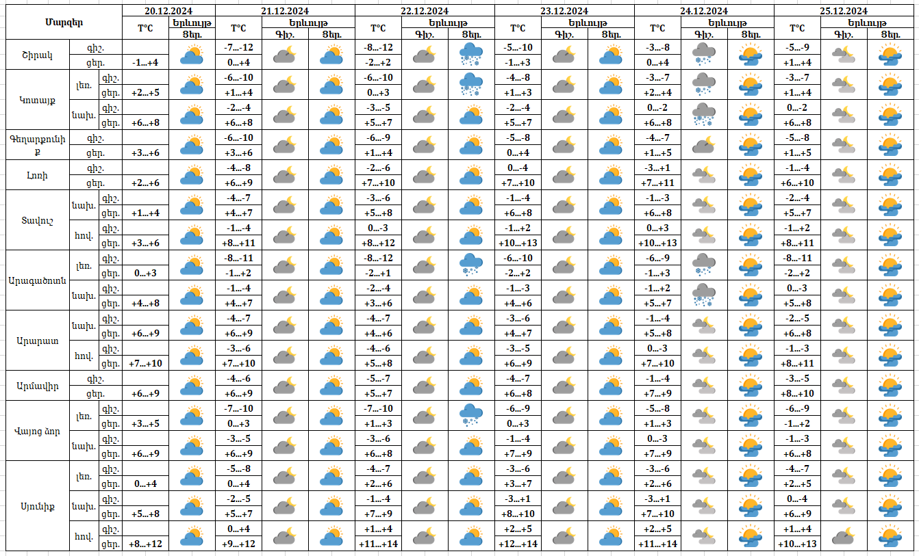 Հանրապետության տարածքում դեկտեմբերի 20-ի ցերեկը, 21-ին, 22-ի գիշերը, 23-ին, 24-ի ցերեկը, 25-ին սպասվում է առանց տեղումների եղանակ։ Դեկտեմբերի 22-ի երեկոյան, 24-ի գիշերն առանձին շրջաններում սպասվում է թույլ ձյուն։