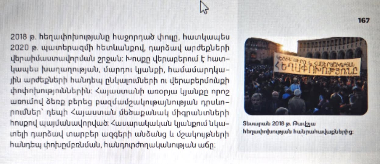 Քաղաքական լոյալության, ակադեմիական անողնաշարության ու քաղաքացիական այլասեռվածության բոլոր տարրերը պարունակող այս պարբերությունը ներառված է 9-րդ դասարանի պատմության դասագրքի մեջ: Ենթադրաբար այս մասը հեղինակել է դասագրքի յոթ համահեղինակներից մշակութաբան Աղասի Թադևոսյանը, ով «թավշյա կրկեսը» սպասարկած ու նիկոլական գաղափարական դարբնոցին համապատասխան մարդաբանական ու մշակութաբանական մշակումներ ու տեքստեր հրամցնող ազգագրագետներ Հրանուշ Խառատյանի, Լևոն Աբրահամյանի, Հարություն Մարությանի թևի ակտիվ ներկայացուցիչներից է: