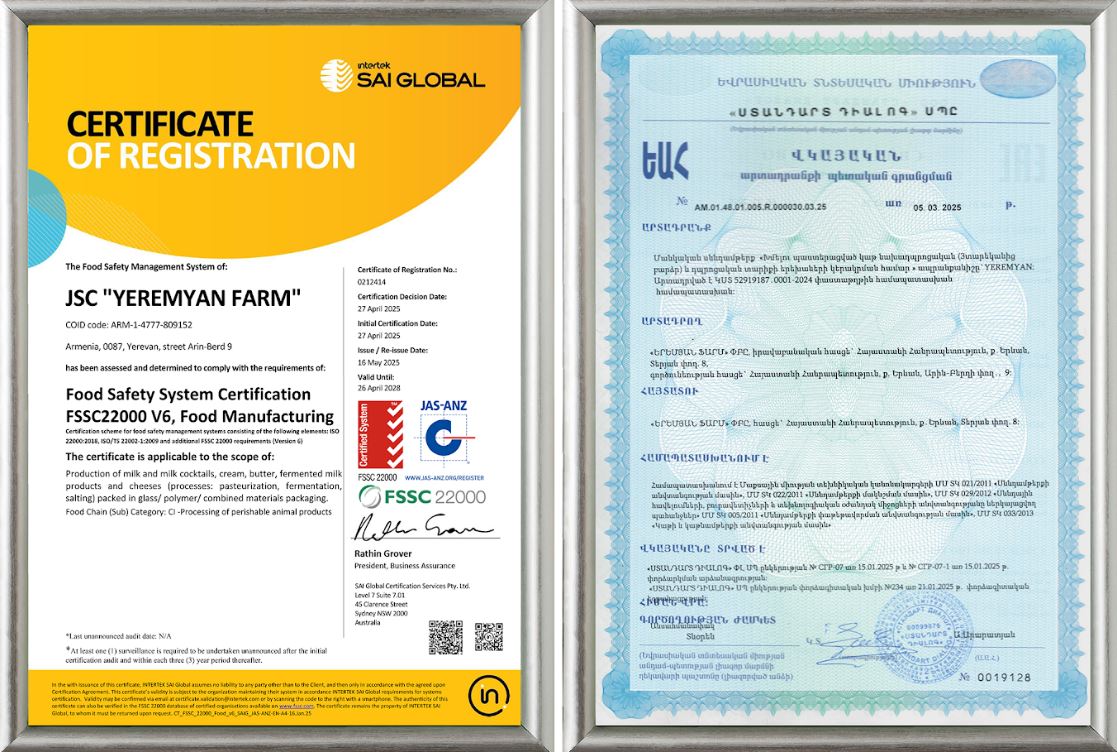 Ի՞նչ է այս ամենը նշանակում։Անվտանգ սնունդ՝ հաստատված ամենահեղինակավոր աուդիտորական ընկերության կողմիցԵրեմյան կաթնամթերքն աշխարհում հեղինակավոր Intertek SAI Global աուդիտորական ընկերության կողմից 2025 թվականին անցել է կաթնամթերքի արտադրության խստագույն ստանդարտ համարվող FSSC 22000 V 6 սերտիֆիկացիոն աուդիտը և ստացել FSSC 22000 (Food Safety System Certification) սերտիֆիկատ։ Երեմյան կաթնամթերքը ոլորտում այս սերտիֆիկատով առաջինն ու միակն է։
